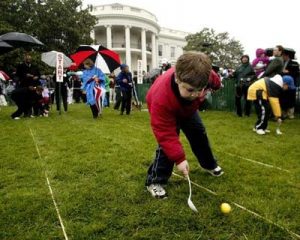 In the USA a big race is held in Washington D.C., on the lawn of White House where children push an egg with a long-handled spoon. Sometimes even the President of the USA takes part.